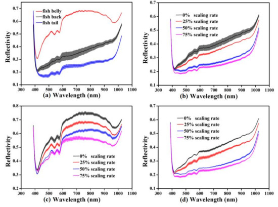 Original mean spectra with SD: (a) mean spectra of the back, belly, and tail regions without scaling; (b) mean spectra of the back region with different scaling rate; (c) mean spectra of the belly region with different scaling rate; (d) mean spectra of the tail region with different scaling rate.