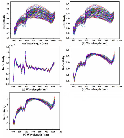 where represents the FD transformation at a specific wavelength (W) midpoint between wavelengths W + 1 and W − 1; is the reflectance value of wavelength W + 1, is the reflectance value of wavelength W − 1, is the difference between wavelength W + 1 and wavelength W − 1. MSC has the ability to eliminate the influence of baseline effect and some multiplicative scattering and transform spectra more closely to the reference spectrum [36]. In this study, MSC was mainly applied to eliminate the relative baseline shift, multiplicative scattering, and the migration between spectra. Therefore, the average spectrum of the whole spectra data set in each region was selected as the reference spectrum, and the corrected spectrum (XMSC) was calculated as follows: