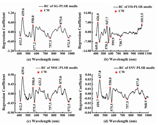 RC (β-coefficients), as a commonly used method of CW selection, often obtains a good performance combined with PLSR. The basic principle of the algorithm is to calculate RC by building a PLSR model using FW. According to the absolute values of RC, the CWs were selected. The peaks or valleys corresponding to the highest absolute values in RC plots were selected as optimal wavelengths [39].