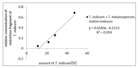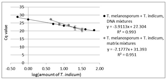 PCR can be influenced by the sample matrix [45], e.g., by coextracted substances. It is also possible that the DNA from some truffle species can be more easily isolated or that the DNA from some species contains more PCR inhibitors. This would lead to an inhomogeneous PCR amplification by samples with more than one truffle species. To assess these effects, five different matrix mixtures of T. indicum with T. melanosporum were prepared (4.3%, 7.4%, 13.5%, 20.4%, 32.2% T. indicum). For the matrix experiments, DNA from each matrix mixture was isolated and analyzed via real-time PCR with both real-time systems, the T. indicum and the T. melanosporum specific primers, in triplicate with 10 ng DNA pro PCR reaction. As in the case of the analyzed DNA mixtures, the standard curve of the matrix mixtures revealed a linear correlation between the Cq values plotted against the logarithm of T. indicum content in T. melanosporum with an R2 of 0.951 (see Figure 1). Eventually, coextracted PCR inhibitors could lead to PCR efficiency under 100%. The results obtained show that the developed real-time PCR opens the possibility to quantify the content of T. indicum admixtures in T. melanosporum also in matrix mixtures, to determine the rate of fraud by replacing expensive truffles by cheaper ones.