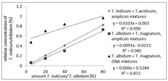 Standard curve of PCR-amplicon mixtures from T. indicum with T. aestivum and T. albidum Pico with T. magnatum with 5%, 20%, 40%, 80% T. indicum/albidum Pico and standard curve of DNA mixtures from T. albidum Pico with T. magnatum with 5%, 20%, 40%, 80% T. albidum Pico. The detected relative areas of PCR-amplicons are plotted against T. indicum or T. albidum Pico amount.
