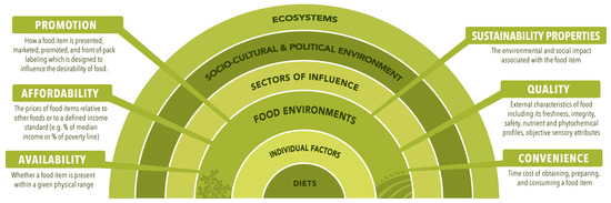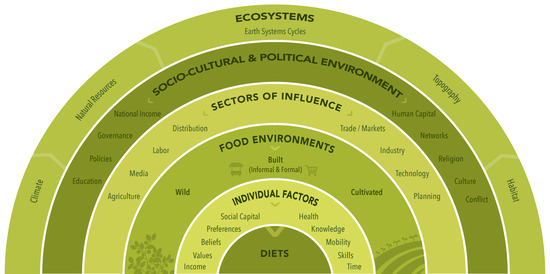 Figure 1 is a graphical representation of the expanded definition of the food environment that we propose based on a socio-ecological model. In this graphical representation, the layers closest to diets (individual factors and food environments) contain the structures and processes that individuals directly interact with in their immediate surroundings, also known as the micro- and meso-systems [65]. Beyond the food environment, there are sectors of influence impacting the availability, affordability, convenience, promotion and quality, and sustainability properties of foods and beverages, which individuals do not generally interact with. These sectors of influence include trade, markets, industry, technology, planning, distribution, labor, agriculture, and media. Beyond these sectors of influence are the broader socio-cultural and political environment, or macro-system, that include factors such as governance, national income, culture, conflict, religion, policy, education, networks, and human capital. Ultimately these various scales of systems are embedded within the ecosystem, which is regulated by earth system cycles and climate, and is dependent on natural resources, habitat, and topography.