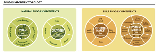Food environment typology. There are two overarching types of food environments comprising the food environment typology including natural and built environments. These further comprise of wild, cultivated, informal market, and formal market food environments.