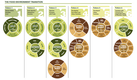 The five societal patterns of food procurement highlighted in Popkin’s [97] nutrition transition framework are associated with a transition of the types of food environments that communities have access to (Figure 4). Specifically, the food environment transition aligned to Popkin’s nutrition transition depicts a shift from hunter gatherer lifestyles (Pattern 1) to agriculture societies that are found in low- and middle-income countries (Patterns 2 and 3), to upper–middle income countries that are characterized as peri-urban and urban developing societies, to high-income developed urban societies (Pattern 5). We added a sixth pattern to the change of food environment types with a food environment transition indicate societies with concerns for sustainable diets and planetary health (Pattern 6).