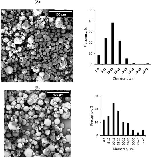 SEM micrographs and diameter distribution of fish oil-loaded microcapsules containing whey protein hydrolysate (WPH) as a film-forming material and glucose syrup (A) or maltodextrin DE21 (B) as the encapsulating agents.
