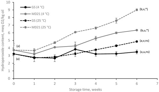 Oxidative stability of the microencapsulates was first evaluated by determining the formation of the primary oxidation products during storage (Figure 2). Right after production, PV of 3.24 ± 1.38 and 3.73 ± 0.66 meq O2/kg oil were obtained for the GS and MD21-based microcapsules, respectively. No significant differences (p > 0.05) in the PV were observed between the two types of microcapsules at day 0, although a significant increase on the hydroperoxide content compared to the fresh oil (PV = 0.36 ± 0.03 meq O2/kg oil) could be noted. This is attributed to the encapsulation process itself, which involves mechanical stress, shear forces and heat, leading to the initial oil oxidation [,]. As expected, lipid oxidation was accelerated for the two types of microcapsules when increasing the storage temperature from 4 to 25 °C. For lipid autoxidation, an increase of 10 °C temperature results in a two-fold increase in the reaction rate []. However, the effect was more pronounced in the MD21-based microcapsules (PV = 9.01 ± 0.13 meq O2/kg oil after six weeks storage at 25 °C). This positive correlation between the lipid oxidation rate and storage temperature on microencapsulated fish oil has also been reported by other authors [,] and could be attributed to the loss of natural antioxidants, as well as an increase in diffusivity of the prooxidant agents (e.g., oxygen, radicals and trace of metals) at higher temperatures.