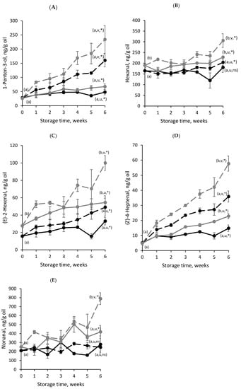 Figure 3 shows the content of the SVOP (1-penten-3-ol, hexanal, (E)-2-hexenal, (Z)-4-heptenal and nonanal) in the microcapsules during storage. Despite the fact that hexanal and nonanal are compounds mainly derived from the oxidation of omega-6 and omega-9 fatty acids, these compounds have also been identified in oxidized fish oil. The rest of the identified SVOP (1-penten-3-ol, (E)-2-hexenal and (Z)-4-heptenal) are typical secondary oxidation products derived from omega-3 PUFAs, and all are related to undesirable odors and flavors []. For instance, the odor of 1-penten-3-ol, hexanal and (E)-2-hexenal have been described as earthy and grassy, while (Z)-4-heptenal and nonanal have been described as creamy and tallowy, respectively [,]. The odor threshold values for these compounds in oxidized oils range from 0.04 to 3.0 ppm [].