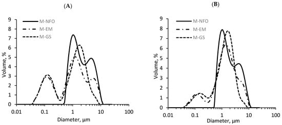 Droplet size distribution of low-fat mayonnaise enriched with: (i) neat fish oil (M-NFO), (ii) emulsified fish oil (M-EM) and (iii) microencapsulated fish oil (M-GS) at (A) day 0 and (B) day 28.