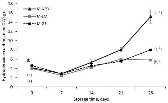 Peroxide value (PV) of low-fat fortified mayonnaise enriched with neat fish oil (M-NFO), emulsified fish oil (M-EM) or microencapsulated fish oil (M-GS) over storage time at 25 °C. Means within the same sampling point followed by a letter, a-c, indicates statistical differences (p ≤ 0.05). Means within the same sample followed by an asterisk (*) indicates statistical differences (p ≤ 0.05) between day 0 and day 28.
