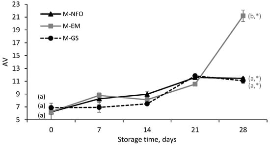 P-anisidine value (AV) of low-fat fortified mayonnaise enriched with neat fish oil (M-NFO), emulsified fish oil (M-EM) or microencapsulated fish oil (M-GS) over storage time at 25 °C. Means within the same sampling point followed by a letter, a-c, indicates statistical differences (p ≤ 0.05). Means within the same sample followed by an asterisk, *, indicates statistical differences (p ≤ 0.05) between day 0 and day 28.