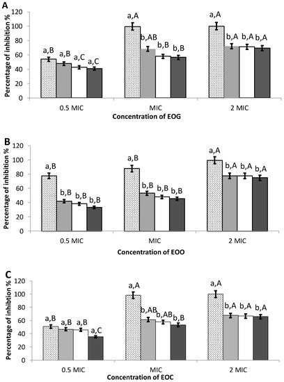 EOs could also be used to work out a surface treatment on preformed biofilm in the food industry to eliminate contamination. The inhibition of preformed biofilms was 61% for EOC, 53% for EOO, and 68% for EOG after 1 h incubation with the MIC (Figure 1). Again, the higher was the dose (from 0.5 MIC to 2 MIC), the more efficient was the effect of the EO in all three cases (p< 0.05). Still, the percentages of inhibition were much lower for preformed biofilms than for the initial cell attachment, in all cases except for 0.5 MIC EOG and EOC, in which they were similar. In 0.5 MIC EOG and EOC, the percentage of inhibition was also rather low for initial cell attachment.