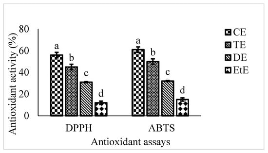 Antioxidant activity of different extracts of RC. CE: Chloroform extract, TE: Toluene extract, DE: Dichloromethane extract, and ETE: Ethyl ether extract. Letters a–d indicates the significance difference among different extracts of RC.
