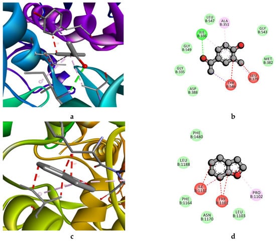 Docking analysis; (a,b). Three-dimensional (3D) and two-dimensional (2D) structures of the interactions between 2-Methoxy-4-vinylphenol and LpxC, respectively, and (c,d). The 3D and 2D structures of the interactions between benzofuran and 4PLB, respectively.