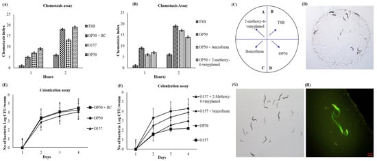 (A) Chemotaxis assay of RC extract compared between E. coli 0157 and E. coli OP50 (basic food for worms), (B) chemotaxis assay compared between OP50 and commercially available identified compounds; 2-methoxy-4-vinyphenol and benzofuran combined with OP50, respectively. (C) The model chart of chemotaxis assay. (D) Chemotaxis assay plate indicates the from the center of the plate worm move towards the test sample equally when compared with control (OP50). (E) Colonization assay indicates the durability of the work when fed [Pathogen—E. coli O157, and Plant extract (RCC extract)]. (F) Colonization assay indicates the durability of the work when fed [Post treatment of 2-methoxy-4-vinyphenol against pathogen—E. coli O157 + benzofuran against pathogen—E. coli O157 + 2,3 and E. coli 0157 (pathogen)]. (G) Stereomicroscopic image on the Morphology of C. elegans after the colonization assay. (H) The stereomicroscopic image indicates the green spots (Syto-9) healthy live cells of the C. elegans after the colonization assay.