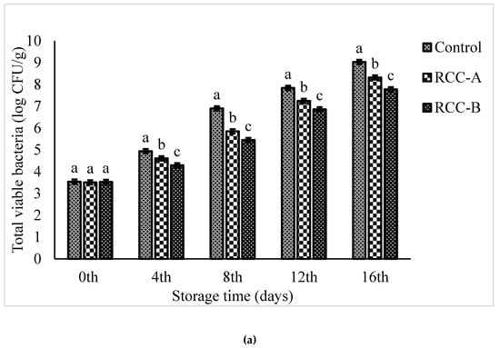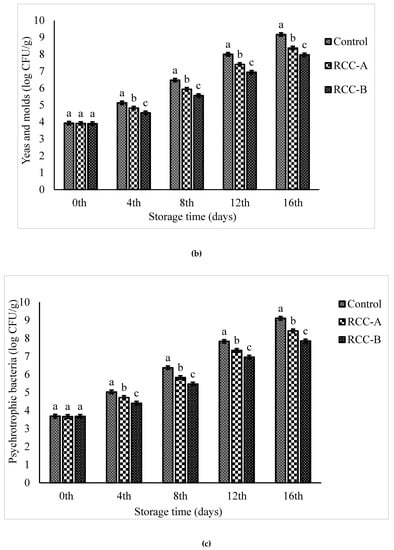 Psychrotrophic bacteria can comprise an important fraction of the natural microflora of beef products, which may cause spoilage of meat at 4 °C storage []. The initial psychrotrophic bacterial counts were found to be 3.68 log CFU.g−1 meat for all categories (p < 0.05). At the end of storage period, the highest psychrotrophic bacterial count was obtained for control (9.11 log CFU.g−1), followed by RCC-A (8.41 log CFU.g−1) and RCC-B (7.85 log CFU.g−1) (Figure 4b).