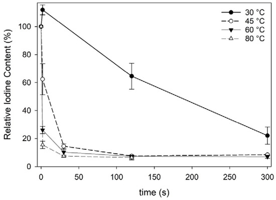 Fresh Norwegian sugar kelp harvested in April 2018 contained 4605 ± 274 mg iodine·kg−1·dw−1, which is comparable to other European cultivated sugar kelp (3460–6568 mg·kg−1·dw−1) [6,7,29,30]. The process of freeze-thawing sugar kelp did not decrease the iodine content significantly (one-way ANOVA; F = 117, df = 15, p < 0.001) (Table 1). However, water blanching decreased the iodine content significantly for all blanching treatments except when treated at 30 °C for 2 s. All blanching treatments, except 30 °C below 120 s and 45 °C at 2 s, sufficiently reduced the iodine content below the maximum level of 2000 mg·kg−1·dw−1 as recommended by ANSES (2018) [12] in seaweed products. The iodine content in the blanched sugar kelp approached a constant level for various treatments with an average content of 328 ± 19 mg·kg−1·dw−1 (Figure 1). Similarly, Stévant et al., (2018) [7] also reported that a constant level was achieved when subjecting S. latissima to warm water at 32 °C for 1 h. The most efficient treatment in this present study reduced the iodine content to 12% relative to the initial iodine content in fresh sugar kelp.