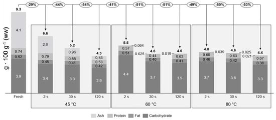 The proximate composition is given for samples after each individual treatment, but does not take the potential loss of biomass into consideration due to processing. From the proximate composition, it cannot be concluded that there is a loss or gain due to treatment, therefore the true retention factors were calculated relative to fresh sugar kelp (Table 3). In Figure 2 the concentrations of each individual proximate and the true retention factors are seen. This together defines the mass balances of the treatments, which can indicate if there is a loss of each individual proximate. The total loss of ash, protein, lipid, and carbohydrate all together (total proximate) for each individual treatment are given relative to the fresh S. latissima. Fresh sugar kelp had a total proximate composition of 9.3 g 100 g−1 ww and the retained total amount of each treatment varied from 4.3 to 6.6 g 100 g−1 ww. The treatment that had the least loss (29%) of proximate was 45 °C at 2 s, whereas the others had a loss that ranged from 41% to 54%.