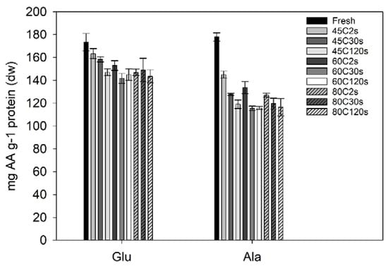 The amino acid composition was quantified for selected water blanching treatments and the fresh sugar kelp sample. Two of the amino acids (glutamic acid and alanine) had a significant loss due to treatments when compared to the fresh sugar kelp (Figure 3). Fresh sugar kelp contained significantly higher amounts of glutamic acid (173 mg·g−1 protein; one-way ANOVA; F = 6.4, df = 10, p < 0.001) when compared to the treated samples, although not when compared to the 45 °C at 2 and 30 s (Tukey’s post-hoc test; p > 0.395). This meant that the treatments with higher temperatures and process times had a significant loss of glutamic acid. On average, the significantly different samples had an average content of 146 mg glutamic acid g−1 protein. For alanine, the fresh sample was significantly different to the treated samples, meaning that there was a significant loss due to processing (one-way ANOVA; F = 52, df = 10, p < 0.001). The content in fresh sugar kelp was 178 mg alanine·g−1 protein and the average of the treated samples were 128 mg alanine·g−1 protein. The entire amino acid profile can be found in the data repository.