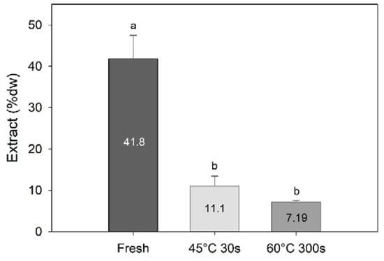 Amount of methanolic extracts (% dw) of sugar kelp for fresh and two different blanching treatments. Different letters represent a significant difference (p < 0.05) between treatments. Data are mean ± SD; n = 3.