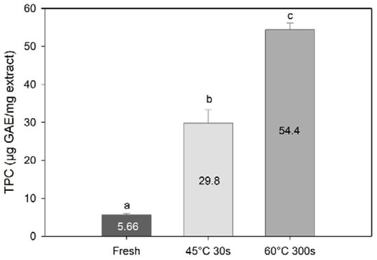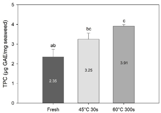 TPC results expressed in gallic acid equivalents per mg of extract revealed an even greater effect of processing on the TPC. Blanching significantly increased the content of TPC as compared to the fresh sugar kelp (one-way PERMANOVA; F = 392, df = 3, p < 0.01, Figure 6). The highest TPC was found in the 60 °C 300 s blanched samples (p < 0.013), followed by the 45 °C 30 s blanched samples, and then fresh samples (p = 0.96). These results suggest that the extraction of other compounds during water blanching may have resulted in concentration of phenolic compounds in the processed sugar kelp.