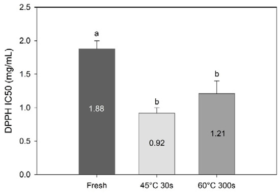 DPPH radical scavenging activity (IC50; mg/mL) of methanolic extracts of fresh and blanched Saccharina latissima. Different letters represent a significant difference (p < 0.05) between treatments. Data are mean ± SD; n = 3.