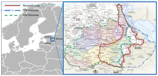 Research area: the approximate area is encircled by a red line. On the right are the administrative boundaries of historical Võromaa and Setomaa, in which place names are written in the Võro dialect (Source: Võro Instituut).