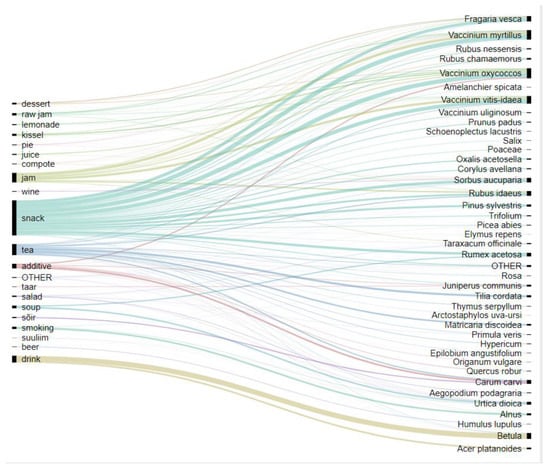 Alluvial diagram of the relationship between the food made and the wild taxa used by both Seto and Estonians together. “Other” refers to taxa/uses with less than 4 detailed use records (DUR).