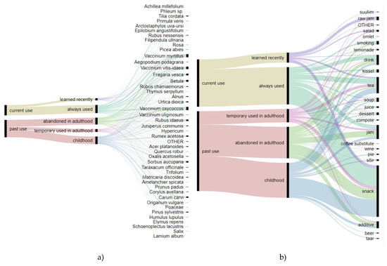 The use of plants has changed considerably over time: A smaller number of uses were reported as used now (37%, 603 DUR) compared to those used in the past (67%, 1017 DUR). The currently used taxa consist of a little less than 8% (127 DUR) that were learned recently and 30% (476 DUR) that were used throughout life. Past uses consist of those used only throughout childhood (28%, 446 DUR), those abandoned in adulthood (25%, 401 DUR), and those used only for short time, e.g., learned during adulthood but no longer used (10%, 170 DUR). The division of taxa and uses on a temporal scale shows that the abandonment or acquisition of uses takes place on a personal not community, level. The exceptions are a few taxa (Salix sp., Schoenoplectus lacustris, Lamium alba–all used as snacks) abandoned in childhood and the use of Achillea millefolium as recreational tea recently acquired by at least three people (Figure 3a, Table 2). On the level of use, the use of beer and beer-like drinks has been abandoned, while a new food, a cold soup called “suuliim”, has recently emerged and the freezing of (mainly) forest and bog berries has become popular (Figure 3b, Table 2).