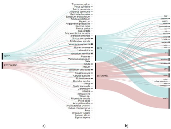 Differences between the Seto and Estonians can be observed on the level of specific taxa or use-group of the plants (Figure 4), i.e., in the details, which need a qualitative approach and further explanation. There were differences on the taxa level depending on the availability of the taxa in the region. A perfect example is Thymus serpyllum, which grows in sandy soils in open areas, as this species is common in Setomaa but is only found in some places in Võromaa. Historically, this plant has had many popular names in the area; however, during fieldwork, only the Seto told us about the plant’s popular name, collection in nature, and use. Several people pointed out that T. serpyllum is disappearing from its usual habitat. Estonians grow this plant in the garden today, but they only use the name derived in the literature and they do not go out to pick it from the wild. Conversely, Origanum vulgare is common in meadows, roadside borders, and sparse forests. The use of O. vulgare as a tea and herb (for blood sausage) is quite common among Estonians, but we did not record such uses among the Seto. Today, the Seto grow this plant in the garden, using only the official name, but they have never picked it from the wild nor used it as a seasoning in blood sausage. The archives reveal that the first time blood sausages were made in Võromaa (Räpina parish) was in the late 19th century. They were undoubtedly made for Christmas and New Year’s; less was done on family holidays. In the 1940s in Võromaa, “vorstirohi” (Origanum majorana) was already being grown in herb gardens. However, the Seto that lived near Pechory began to put “vorstirohi” (probably also O. majorana) in blood sausages in the 1930s, yet it was bought in shops as a ready-made dry seasoning []. This may also be the reason why they did not substitute this seasoning later for the wild one (O. vulgare): They could not associate the use of shop-bought seasoning with the local plant.