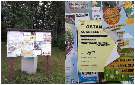 The current commercialization of wild food plants is affected by market demand on the one hand and the distribution of subsidies to poor border areas (Setomaa Development Program, Border Area Development Program, etc.) on the other. Today, market demand is primarily concerned with the purchase of wild mushrooms and berries. During fieldwork, we observed numbers of buying announcements at the area’s bus stops, on the walls of small shops, and in the public advertising spaces of village centers (Figure 5). Middlemen with small vans drive around the villages two or three times a week during the season and stop at bus stops at particular times. There are several middlemen working in parallel. Wild mushrooms (mostly chanterelle) and wild berries are purchased. According to interviewees, it is mainly retired people who sell mushrooms to earn some extra income. Indeed, the region has a high proportion of older people. Working-age people, who live in rural areas, are already very busy. Thus, there is a severe labor shortage during the berry ripening and mushroom growing season. We were repeatedly told by interviewees that in Soviet times the forests were full of berry pickers and mushroom gatherers and there were not enough mushrooms or berries for everyone. Now the opposite is true, as forests and bogs are full of mushrooms and berries, but there are no pickers. However, the most recent high-turnover commercial purchase period lasted from the 1990s until the 2000s, when bilberries were bought in abundance. As for today (2018–2019), it was repeatedly said by interviewees that now it is not worth going to pick berries for personal consumption because the long journey does not pay off, and in the past, it only paid off if most of the berries were sold. It was also said that the use of bilberries in particular has been influenced by intensive forest management since the early 2000s. Because of this, old forests suitable for bilberries have been cut down and there are simply no more berries in the areas where people used to pick them. Similar results have been obtained from a recent nationwide survey of bilberry pickers. It turned out that berry-pickers preferred the public forests familiar to them to protected areas, whereas 60% of respondents said that they experienced the loss of berry sites due to clear-cutting [].