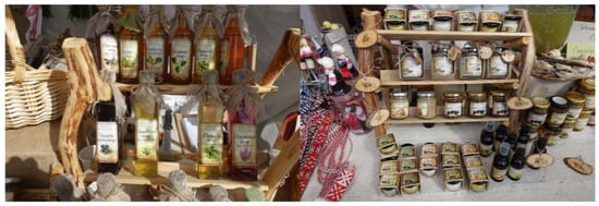 We also saw wild berry wines in addition to horticultural wines (strawberry, rowan, apple, red currant, marigold, etc.) at one of the most progressive home restaurants in the region, Maagõkõnõ, in Saabolda village. However, their Viburnum opulus wine, for example, has never been made in the region, either historically or today, based on our fieldwork. However, both Nopri Farm and Maagõkõnõ sell the region’s special product, namely raw cheese (sõir) that is seasoned with Carum carvi seeds. However, cumin is no longer picked locally but rather bought in the shop. There are active workshops in the area to prepare different food products. For example, Räpina Creative House offers home wine courses and makes wild berry wines, such as cranberry, which are sold at local fairs. One of the biggest tourism and identity events in the area is the annual Seto Kingdom Day in August. This is the only place where so-called semi-officially sold home-made vodka, handsa, can be found. In 2019, for example, one producer sold “handsa” flavored with Vaccinium myrtillus berries. This drink is also mentioned in old archival texts. Additionally, in 2018 and 2019, various handmade products were on sale (Figure 6): Pine cone jam; juniper twig syrup, and sea-buckthorn berries in juniper syrup; juniper berry salt and mustard; dandelion flower honey, dandelion syrup and dandelion syrup with rhubarb; rosebay willowherb flower syrup and meadowsweet flower syrup; cowberry jam with apple and pear; spruce needle honey; and birch bud syrup and herbal mixtures for tea. Tourism has therefore created new site-specific products and also helps to keep traditional products alive.
