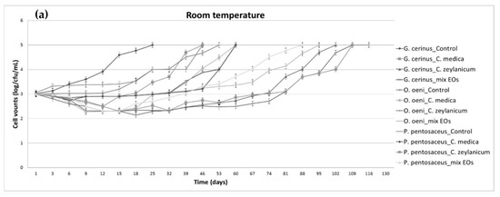 Subsequently, the resistance of low alcohol wines supplemented with C. medica and C. zeylanicum EOs against the growth of spoilage microbes was further investigated. In this vein, wines supplemented with C. medica or C. zeylanicum EOs, either separately or in combination and wines with no EOs were deliberately inoculated with O. oeni, P. pentosaceus, G. cerinus, D. bruxellensis, C. zemplinina, H. uvarum, P. guilliermondii and Z. bailii, separately. Microbial growth was monitored at room temperature or refrigerated temperature (Figure 1 and Figure 2). The results showed that in all cases microbial counts were significantly (p < 0.05) lower in wines supplemented with the EOs.