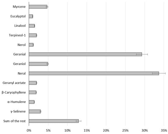 The composition of the essential oil (volatile and semi–volatile compounds) was characterized by GC–HRMS. To characterize the relative abundance of volatile components in the sample, deconvolution of all compounds was performed, and the detected compounds were normalized by percent of total peaks area (Figure 1). The compounds occurring at a level higher than 1% were identified. The most dominant components in the sample were as follows: two stereoisomers of citral (geranial and neral) >> geraniol–myrcene > γ-selinene > terpineol-1–geranyl acetate > β-caryophyllene > linalool > α-humulene > nerol > eucalyptol. The repeatability of the method, expressed as a relative standard deviation (RSD), was determined by the analysis of the oil sample in six repetitions, and ranged from 1.5% to 5.5% in all analyses.