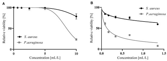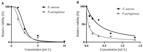 The antimicrobial activity of citral was previously measured for E. coli. The determined value (≥0.01%) [] corresponds to our observation for Gram-negative bacteria (41–97 µL/L). Similar to our results, Gupta et al. also demonstrated that citral has a stronger antimicrobial activity than lemongrass essential oil []. Citral was up to 10 times more active against some Acinetobacter baumannii strains than lemongrass essential oil in the study of Adukwu et al. [].