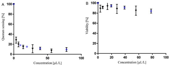 Dose-dependent effect of lemongrass essential oil (blue circle) and citral (black triangle) on V. campbellii BAA1118: (A) quorum sensing inhibition, (B) cell viability. The data are presented as an average of 3 repetitions with SEM.