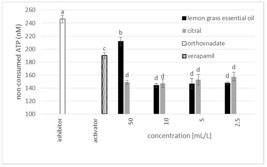 P-glycoprotein activity inhibition was determined as the amount of ATP which was not consumed during the efflux pump activation in comparison to the control. Orthovanadate (white columns), a known inhibitor of P-gp, was used as a positive control, verapamil (dotted columns) was used as known activator and lemongrass essential oil (black columns) and citral (gray columns) were tested in the concentration range 2.5–50 mL/L. Data are presented as an average of 3 repetitions (n) with SEM. Data were analyzed by one-way ANOVA with Duncan’s post hoc test (P > 0.05) as indicated by the superscript letters. Statistically significant levels were denoted with different letters.
