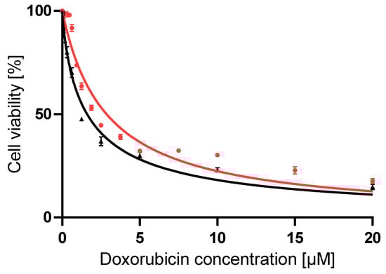 Inhibition of human ovarian carcinoma viability by doxorubicin (red line) and doxorubicin with lemongrass essential oil (10 µL/L, black line) after 72 h.
