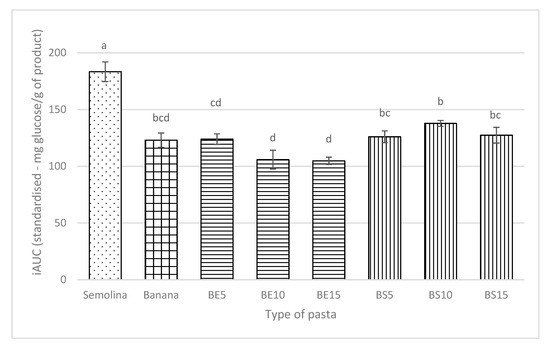 Area under curve (iAUC) values of banana pasta and banana pasta with protein addition (BE5, BE10, BE15 = Banana pasta with 5, 10, 15 g egg white protein/100 g banana flour, BS5, BS10, BS15 = Banana pasta with 15 g soy protein/100 g banana flour) compared to semolina pasta as a control. Different letters above the bars indicate values which are significantly different from each other (p > 0.05), according to Tukey’s test.