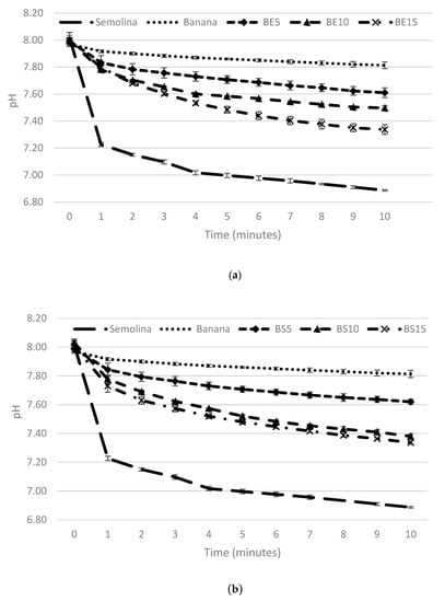 The pH change over time during multi-enzymes (trypsin, chymotrypsin and protease) incubation of semolina, banana pasta and banana pasta with protein addition: (a) BE5, BE10, BE15 = Banana pasta with 5, 10, 15 g egg white protein/100 g banana flour; (b) BS5, BS10, BS15 = Banana pasta with 15 g soy protein/100 g banana flour.