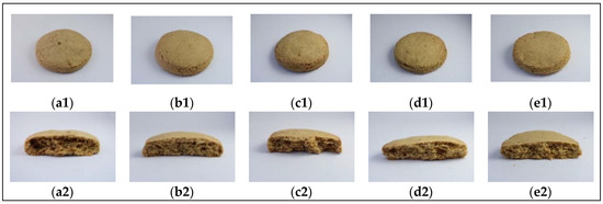 Figure 1 shows photographs of the cookies formulated using different levels of wheat flour substitution with orange by-product flour (OBPF.) The photos were taken in the following two ways: an image of the entire cookie from the top (Figure 1(a1–e1)) and an image of the cookie when cut in half (cross section) (Figure 1(a2–e2)).