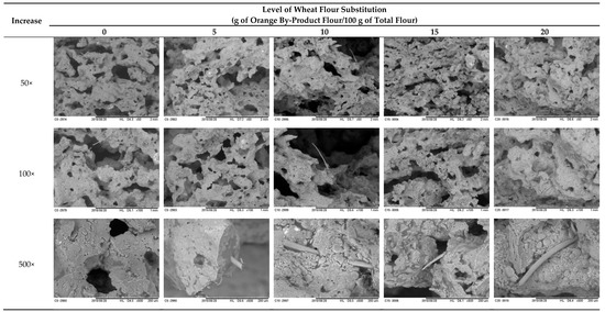 Images obtained from scanning electron microscopy (SEM) analysis of cookies produced by wheat flour substitution with orange by-product flour (OBPF), at magnifications of 50×, 100× and 500×.