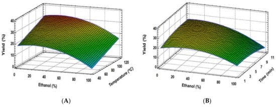 Response surface plots of the extraction yield as affected by independent factors; ethanol (%) vs. temperature (A), ethanol (%) vs. time (B).