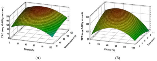 Response surface plots of the TPC as affected by independent factor; ethanol (%) vs. temperature (A), ethanol (%) vs. time (B).