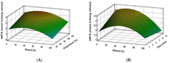 Response surface plots of the ABTS as affected by independent factors; ethanol (%) vs. temperature (A), ethanol (%) vs. time (B).