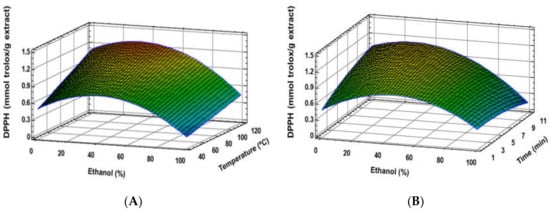 Response surface plots of the DPPH as affected by independent factors; ethanol (%) vs. temperature (A), ethanol (%) vs. time (B).