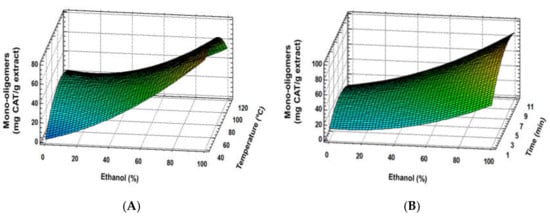 Response surface plots of flavan-3-ol monomer and oligomer content as affected by independent factors; ethanol (%) vs. temperature (A), ethanol (%) vs. time (B).