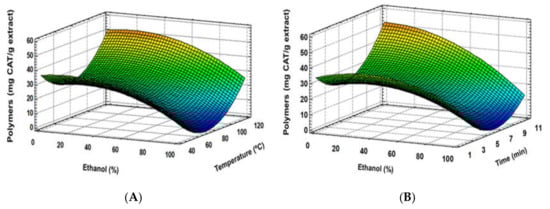 Regarding total flavan-3-ol monomers and oligomers or total polymers of procyanidin content, experimental data did not fit with the quadratic proposed model, suggesting more complex behaviour. Nevertheless, according to response surface plots, extraction solvent resulted as the main factor in the total mono-oligomer demeanour, whereas temperature and time were remarkably less meaningful. Ethanol seems to enhance flavanol-3-ol monomer and oligomer extraction (Figure 5A), while temperature or time influences are less clear (Figure 5A,B). Opposite to that, higher ethanol proportions seem to reduce the extraction of total polymer procyanidins, while temperature increased their extraction yield (Figure 6A). In this case, although extraction time turned out to show a positive tendency, an important interaction between time and the rest of studied factors distorted the effect of time into an overall negative trend (Figure 6A,B). Moreover, temperature increase resulted in a higher extraction of polymers, while ethanol had a suppressive effect, but enhanced the flavan-3-ol monomer and oligomer yield. Sun and Spranger [] indicated that temperature allowed higher proanthocyanidin extraction rates if the temperature did not reach a degradation point. Likewise, solvent mixtures with higher polarities improve the extraction of these compounds, disrupting the bonds between phenolic compounds and the matrix. In this sense, Karvela et al. [] found that greater flavanol monomers contents were reached at 60% of ethanol:water, whereas oligomers and polymer proanthocyanidins were achieved at 44% and 55%, respectively.