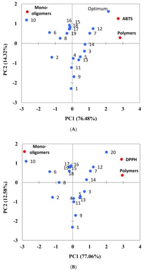 Additionally, a PCA was carried out to understand correlations between procyanidins and antioxidant activity. The principal component of the analysis explains a 90.79% of the samples. The antioxidant activity, determined using the ABTS method, was mainly explained by PC1 (76.48%) whereas PC2 contributed to a lesser extent (14.32%) (Figure 7A). Therefore, PCA analyses showed a strong correlation between the polymer content and the total antioxidant activity of the samples. Therefore, those samples characterised by higher amounts of polymers, being samples 7, 12 and the optimum extract, showed greater antioxidant activity. These samples were characterised by the use of high temperatures during PLE extraction (104 °C, 120 °C and 120 °C, respectively), being in concordance with the polynomial equations of the fitted models (Table 3). Additionally, the proximity of samples 3 and 14 in the PCA graph, as well as sample 7, evidences the influence of the extraction time. Similar results were observed when PCA analysis was conducted for DPPH values (Figure 7B), explaining 89.65% of the samples.
