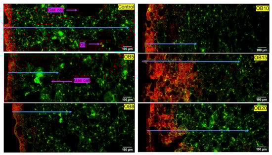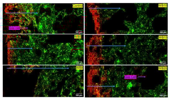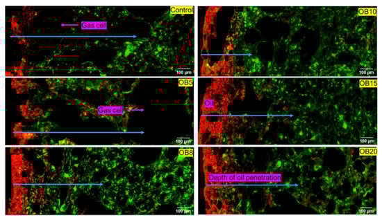 Cross-sectional micrographs of OB fried dough are presented in Figure 1. As can be noticed in all samples, there is intensity of red colour (oil) clusters at the crust section and subsequent penetration at different depths into the solid matrix - indicated by the diminishing intensity of red dye (or blue arrows) from the crust to the crumb in the solid matrix, thus confirming that oil uptake in magwinya is a surface-related phenomenon following a crust-to-crumb path flow. Depth of oil penetration shows a similar proximity to the crust at 5 and 8 g and further from the crust at 10–20 g OB. It is worth noting that the sample size used for microscopy may not reflect the whole sample compared to conventional techniques. Pores in fried dough (Figure 1) were small and almost evenly distributed while in fried batter (Figure 2), the pores were mostly large. Large pores are indicative of a weak gluten–starch matrix and thin liquid lamellae caused by reactions between surface active agents of the dough and gluten network, which collapses upon heating, leading to the formation of large coalesced gas cells in the crumb [24]. This consecutively causes large pathways in the dough for oil penetration—hence the increased depth of penetration compared to fried dough samples, which had better stronger structural integrity. These qualitative observations are supported by the Soxhlet extraction results, where fried batter absorbed more oil than fried dough samples.