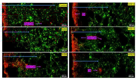 Cross-section micrographs of fried batter enriched with wheat bran (WB). Red = oil, green = batter matrix. Blue arrows indicate depth of oil penetration in the solid matrix. WB5–WB20 represent wheat bran concentration (g) in product formulation.